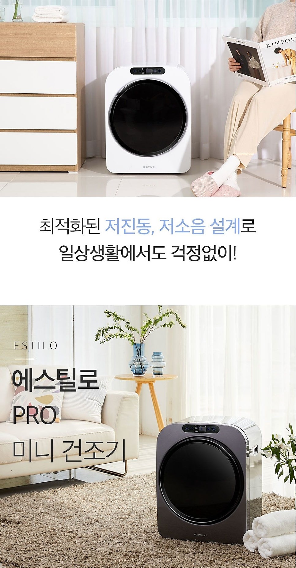 아파트에서 가전제품 사용할 때 가장 걱정되는 게 소음 문제잖아요? 에스틸로 미니 건조기는 45.6dB 저소음으로 설계되어서 정말 조용해요!