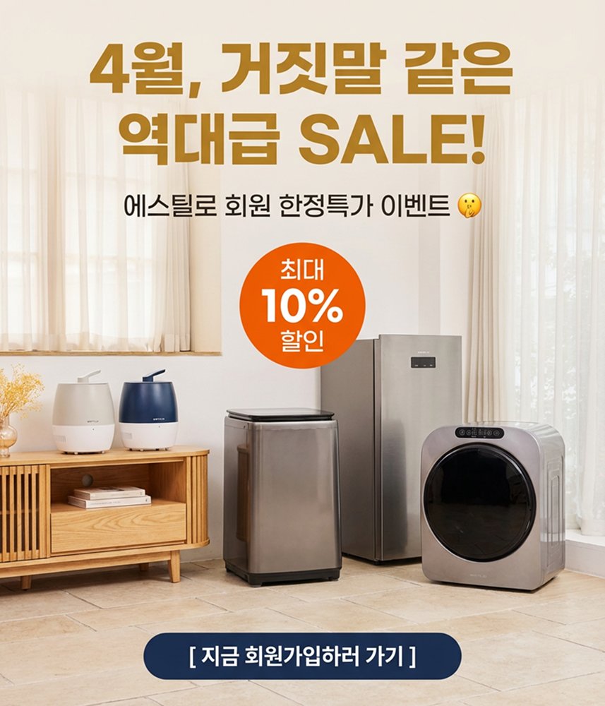 에스틸로에서 정말 좋은 소식이 하나 있어요! 이번 4월 한 달 동안 회원가입만 해도 전 제품 할인 특가를 받을 수 있거든요.